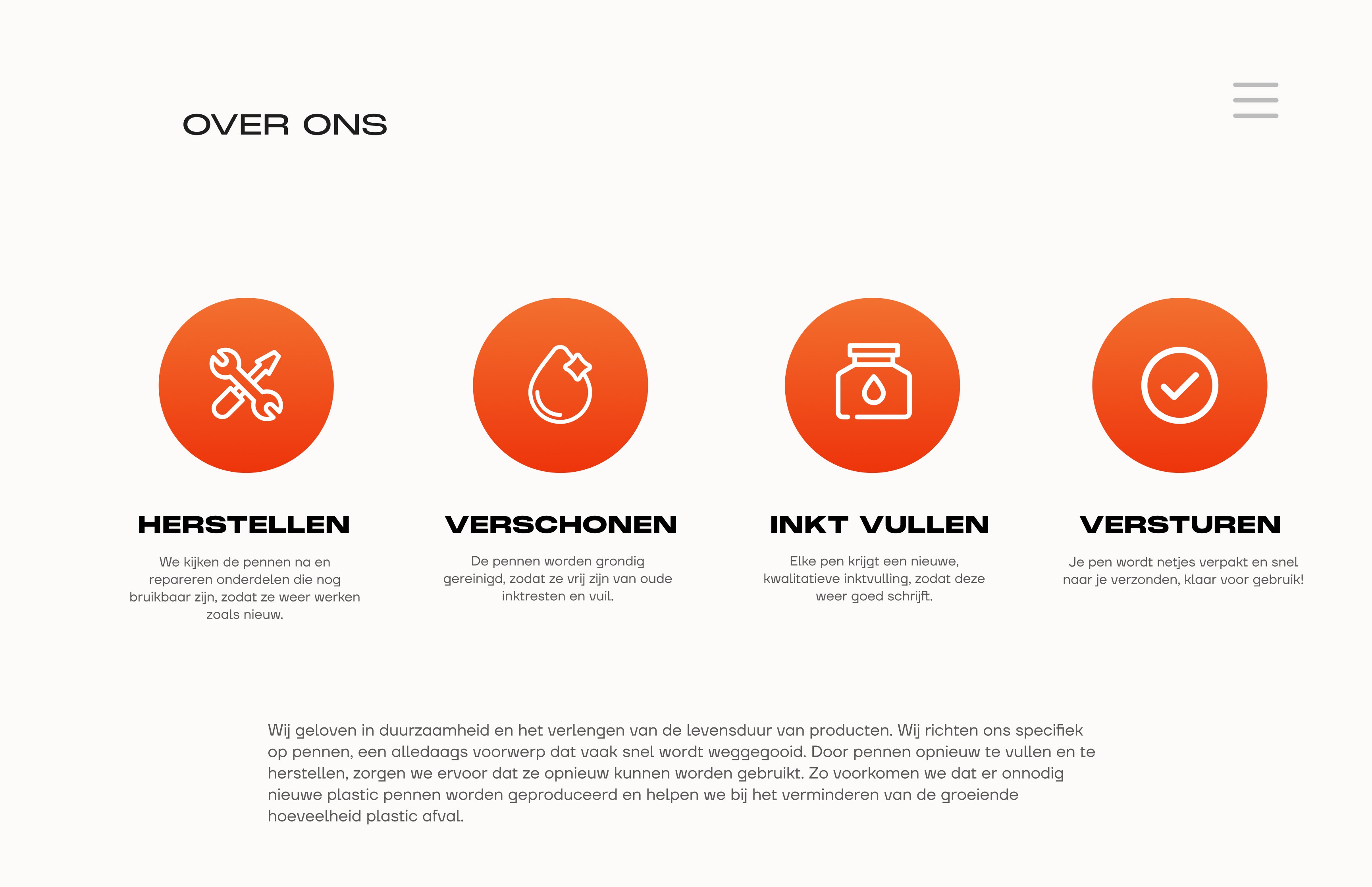 Instead of a standard webshop layout, I chose a clean, modern style with abstract shapes and compositions. Think soft orange and vellum tones that evoke creativity and optimism, as if the pens are truly being given new life. The name Pencirkels refers not only to the rounded shapes present in much of the design but also to the circular nature of the product itself.