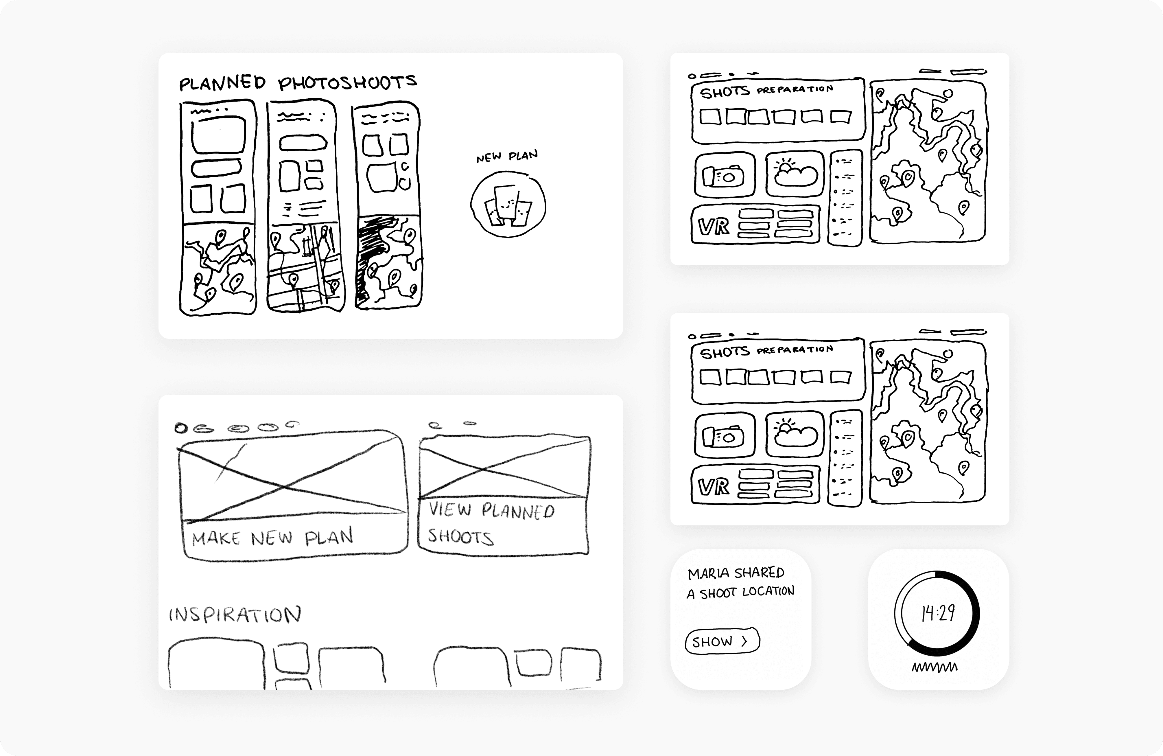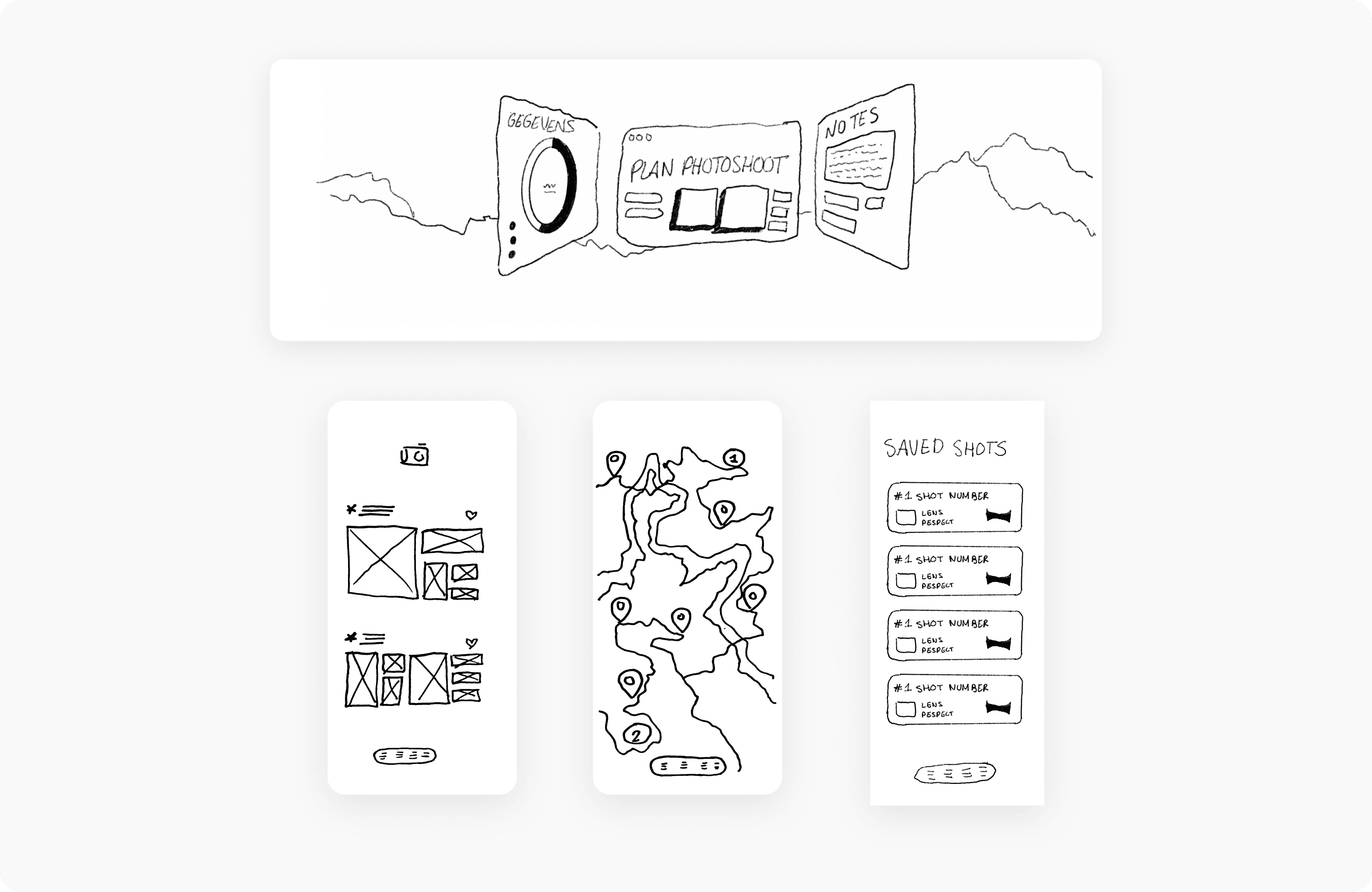After the research phase, I created the first sketches and wireframes to visualize Vision Shooter’s workflow. The design focused on a continuous design approach, ensuring that users can carry on their planning seamlessly across devices. This is crucial for photographers who prepare location settings and compositions on desktop, then use the app in VR for exploration and shooting.